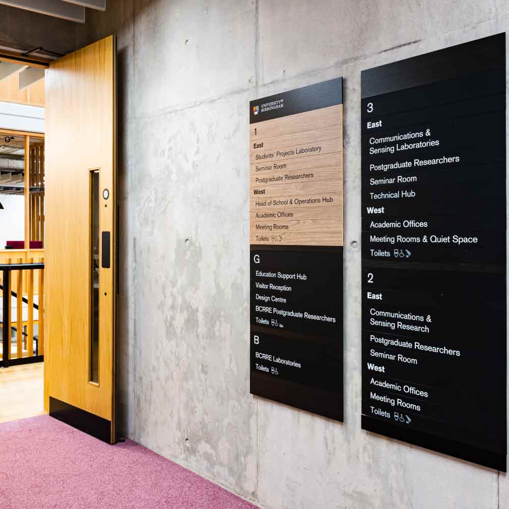 An example of architectural signage is the new Teaching and Learning Building at the University of Birmingham. Mark Shaw-Smith and the xsign team worked with the building architects and construction company to make more of the signage from the beginning.