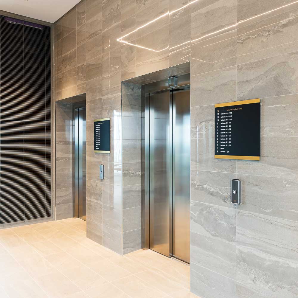 Small details are a big deal in architectural signage. For example, the projecting signs are affixed to a wall with a bracket that matches the wall substrate in colour. This makes the design look sleek and sophisticated.